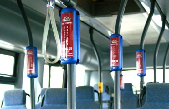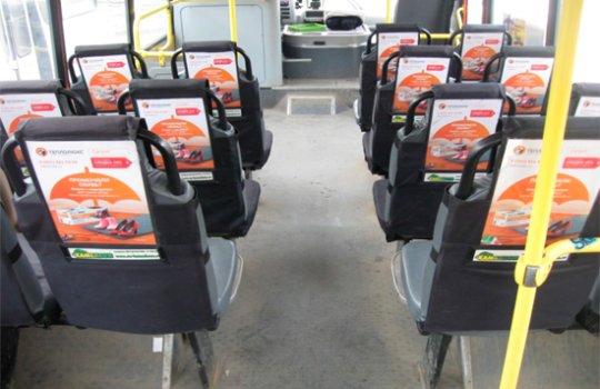 Реклама на подголовниках в троллейбусе на фото выше